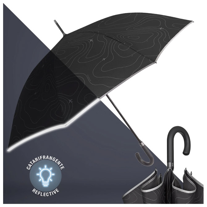 automatik; s plastičnom ručkom; polumjer zatvorenog kišobrana: 69 cm; 8 panela; fi: 120 cm; otporan na vjetar; žice od fiber glass-a; od mikrofibre (odbija kapljice kiše i brzo se suši); iznimno lagan; s bijelim reflektirajućim rubom; s otisnutim mat/sjajnim efektom na platnu